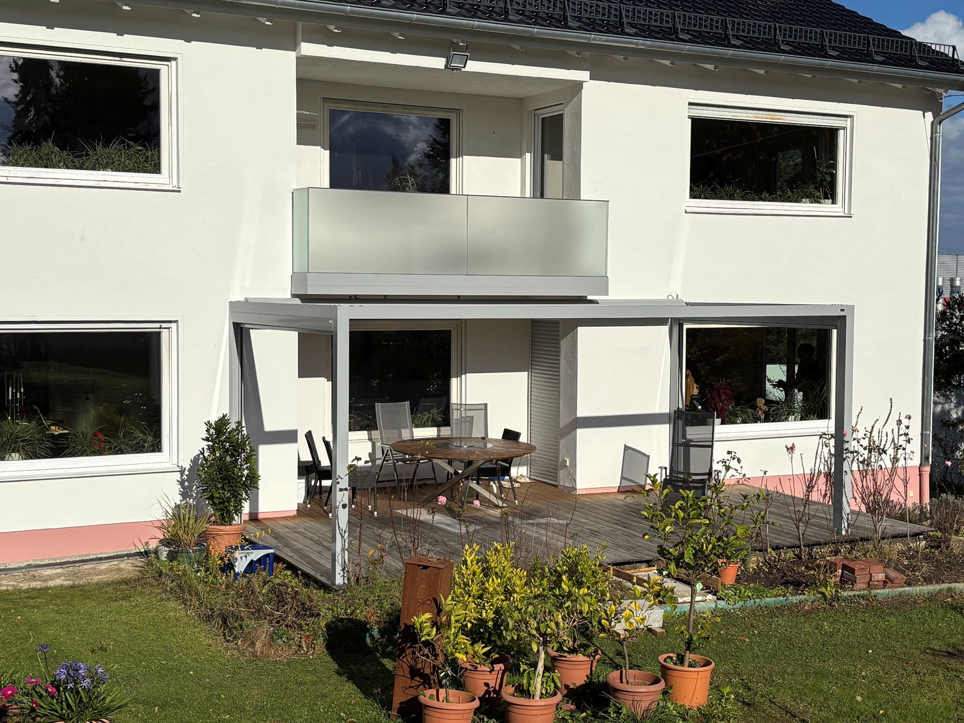 Balkongeländer mit Milchglasfüllung und doppelter Stirnseitenblende