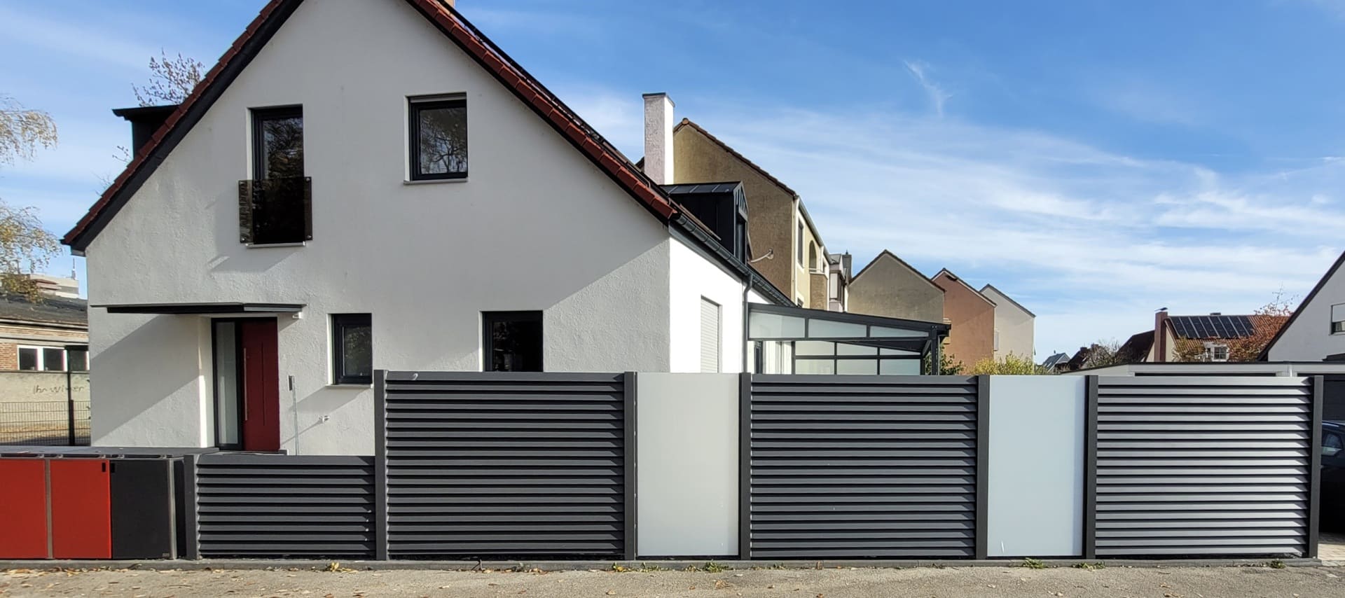 Zaunanlage aus Aluminium mit Tonnenhäuschen und Türchen