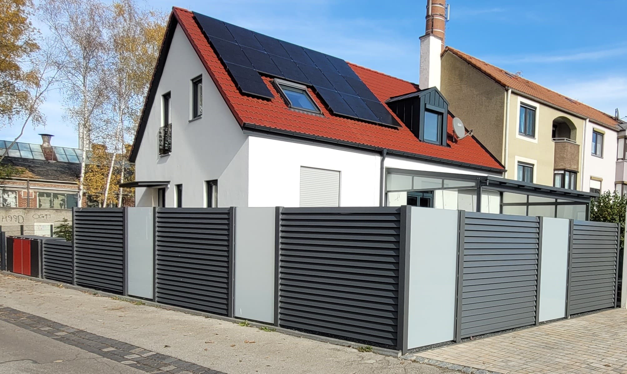 Zaunanlage aus Edelstahl Aluminiumfüllung mit Tor Briefkasten und Türchen